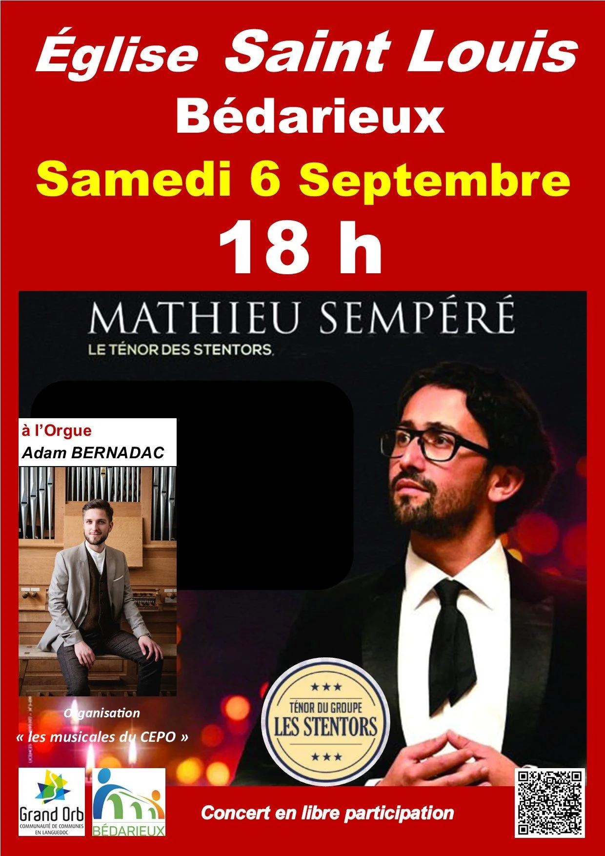 Voix et Orgue samedi 6 septembre 2025 18:00 19:30 Eglise Saint-Louis 19 Avenue Abbé Tarroux Bédarieux, Occitanie, 34600 France (carte) Google Agenda ICS
